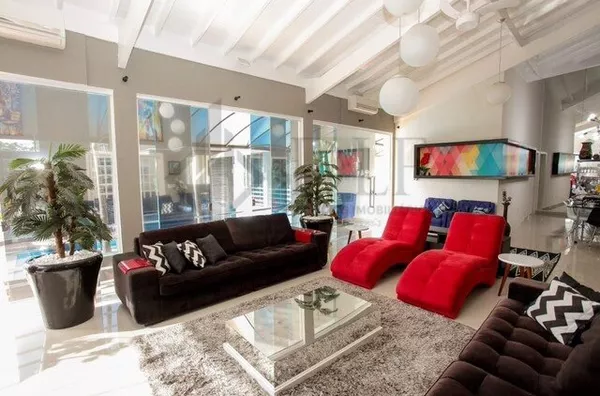 SALA 3 AMBIENTES 80mts com pé direito bem alto, , ventiladores e ar condicionado, sofás , poltronas, quadros, mesa jantar 10 lugares, vasos, espelho em toda parede , decoração em gesso,cristaleira ,aparador.