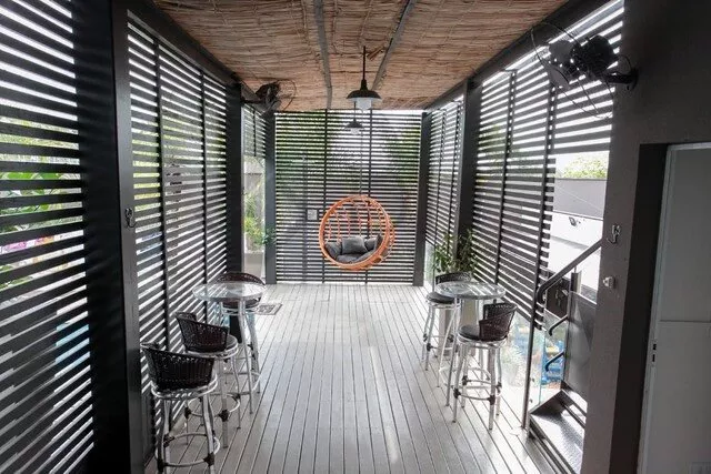 PERGOLADO 9.0 x 3.0 madeira com vidro na sua cobertura, cadeiras, sofás, ventiladores, mesas e banquetas