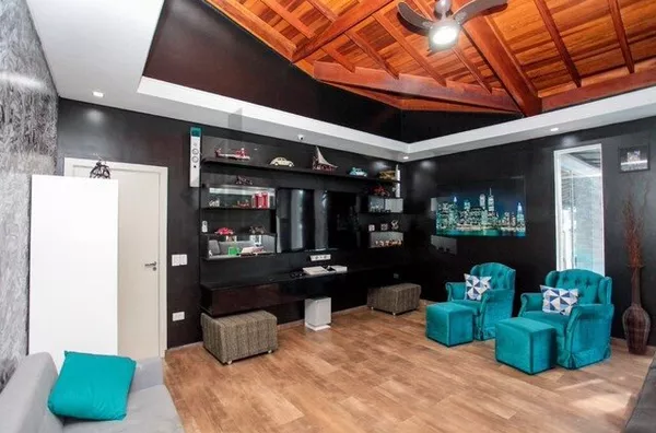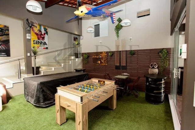 SALA DE JOGOS ventiladores, sofás de 2 e 3 lugares, mesa bilhar, mesa pebolim, aparador, bistrôs, vaso, tv 40, acabamento gesso, jardim de inverno.