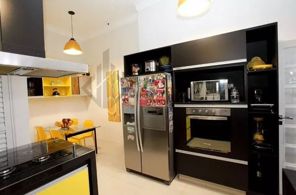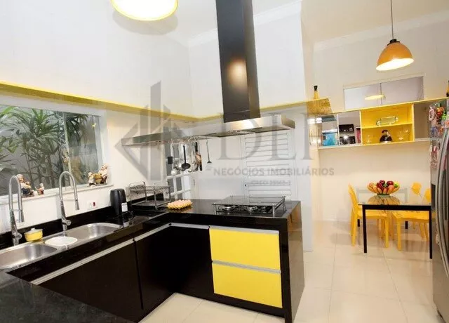 COZINHA pé direito alto, forno elétrico de inox, forno microondas de inox, geladeira side by side de inox ( sai gelo e agua ) fogão coqui top, coifa inox, armarios preto e amarelo, mesa 4 lugar para café da manhã , pia com 2 cubas e torneiras .