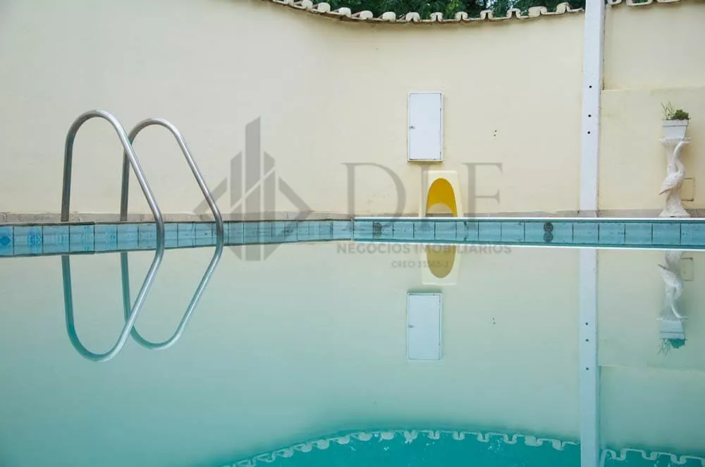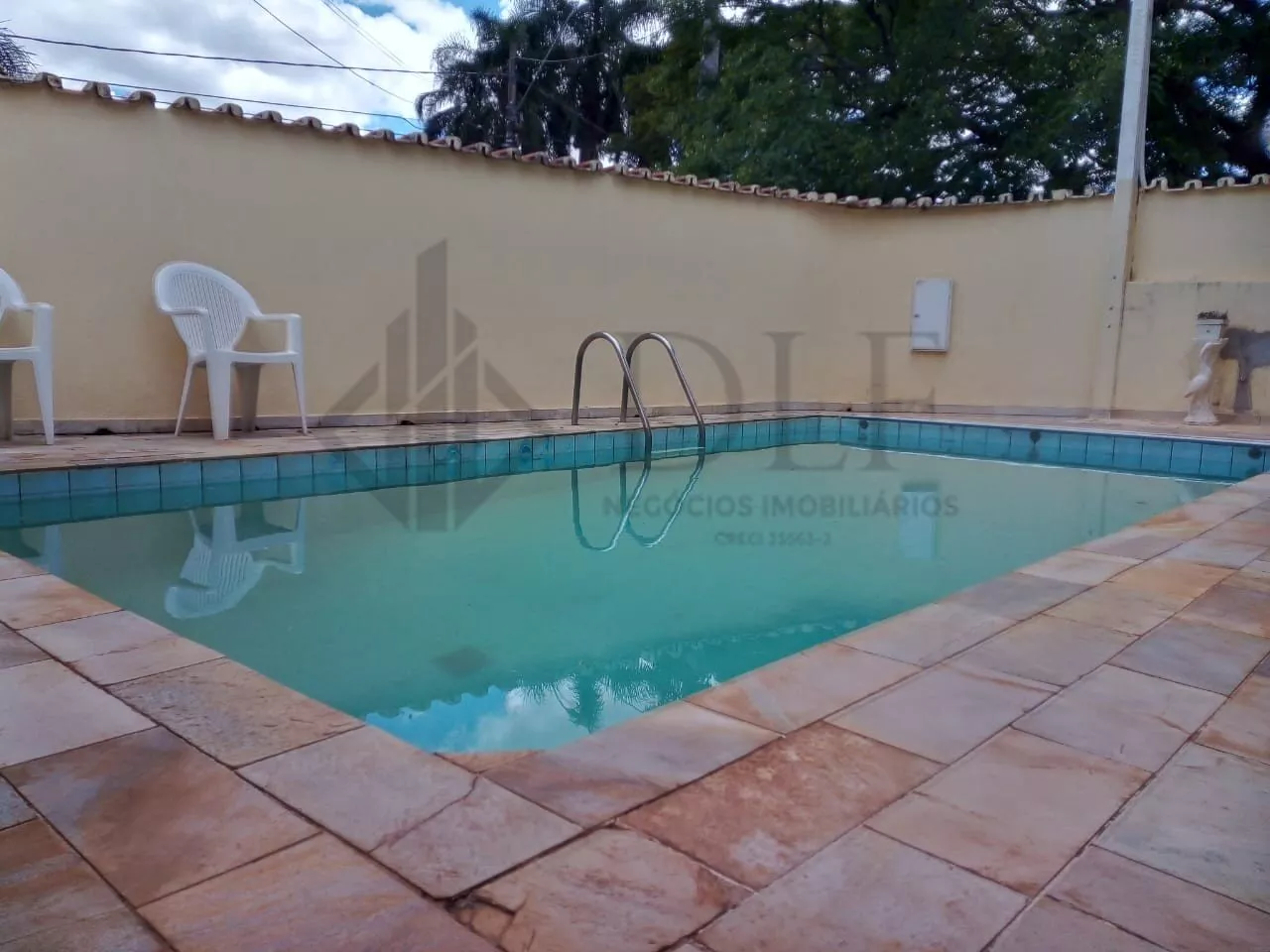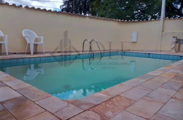 Piscina, espaço gourmet, garagem coberta, canil, quarto de depósito e banheiro externo.