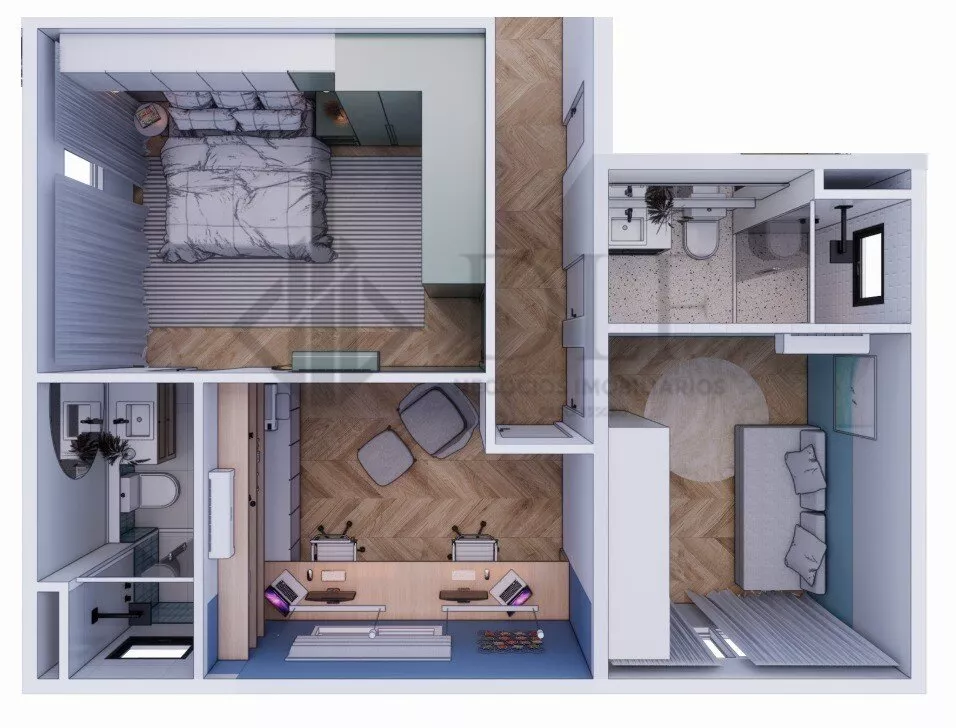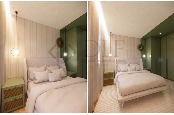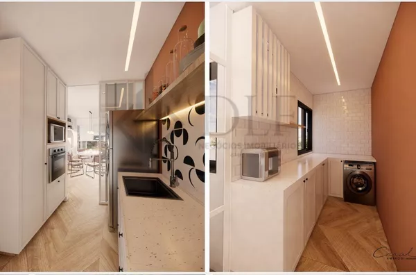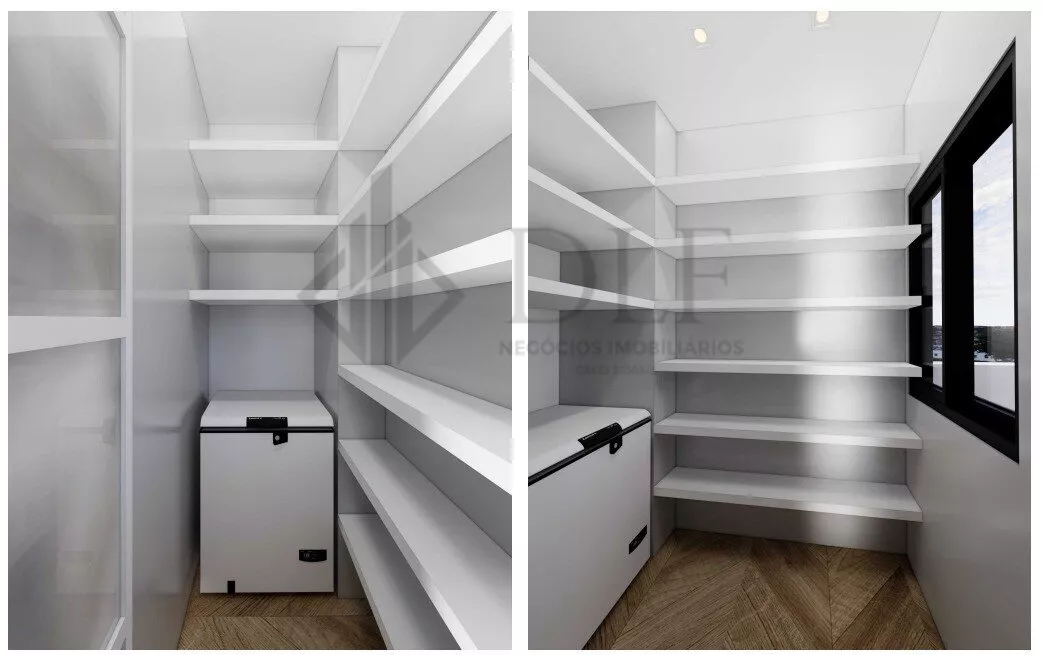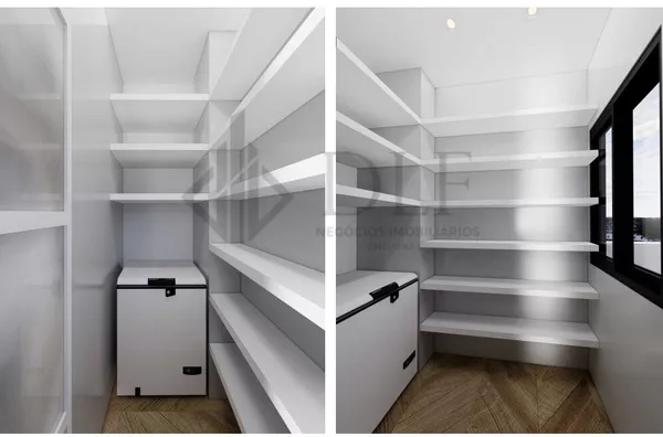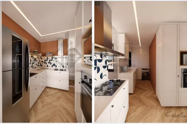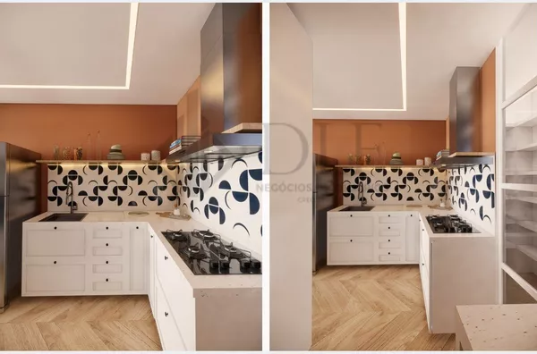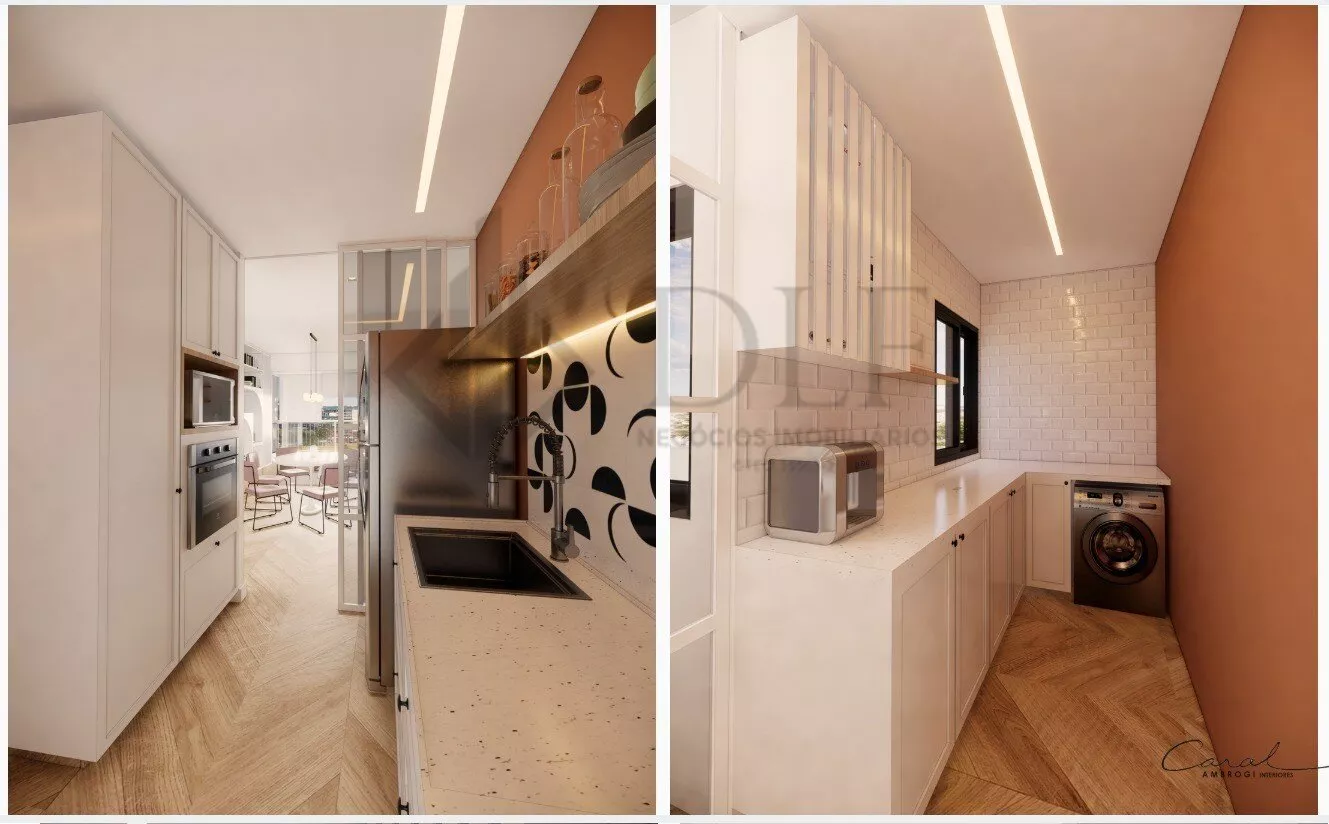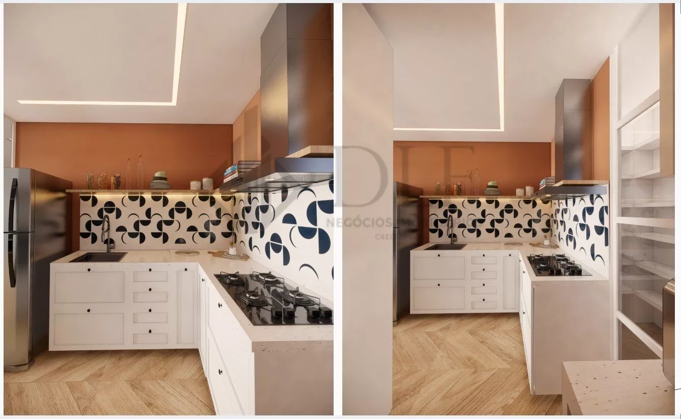 Ele já possui um projeto completo de interiores e reforma, com detalhamentos de materiais, modificações na alvenaria, iluminação, pisos e marcenaria. Uma despensa anexada à cozinha foi inteligentemente adicionada, otimizando ainda mais o espaço e a funcionalidade.