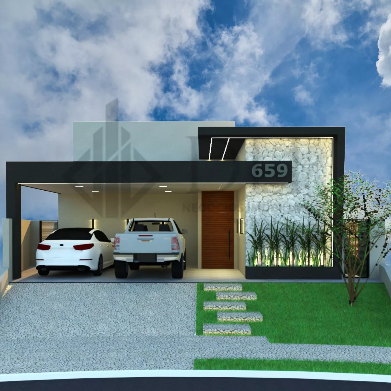 Garagem coberta para 2 carros, com infraestrutura para carregador de carro elétrico.