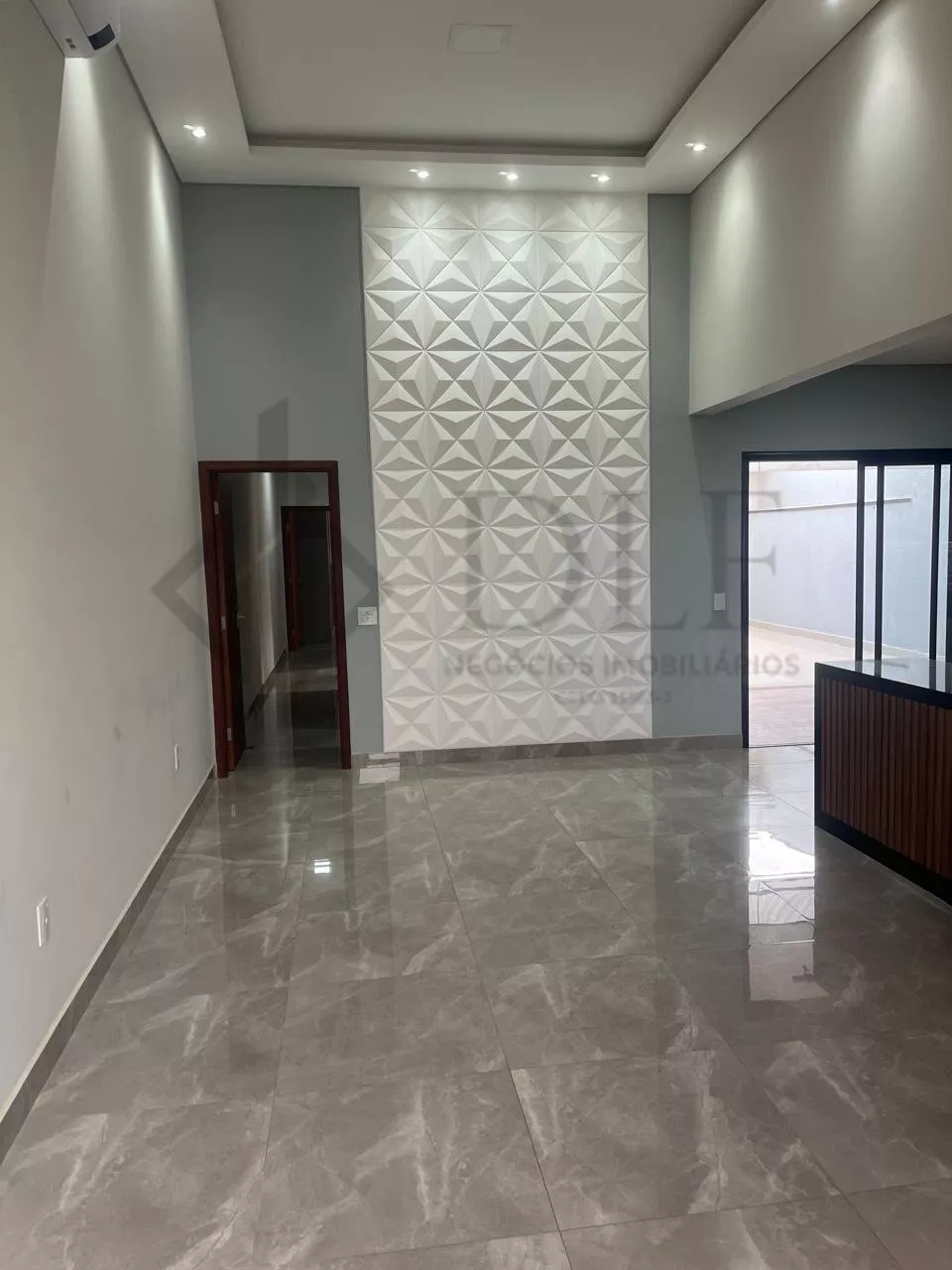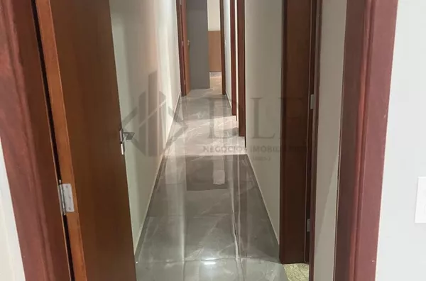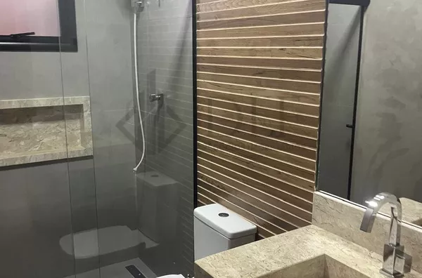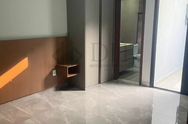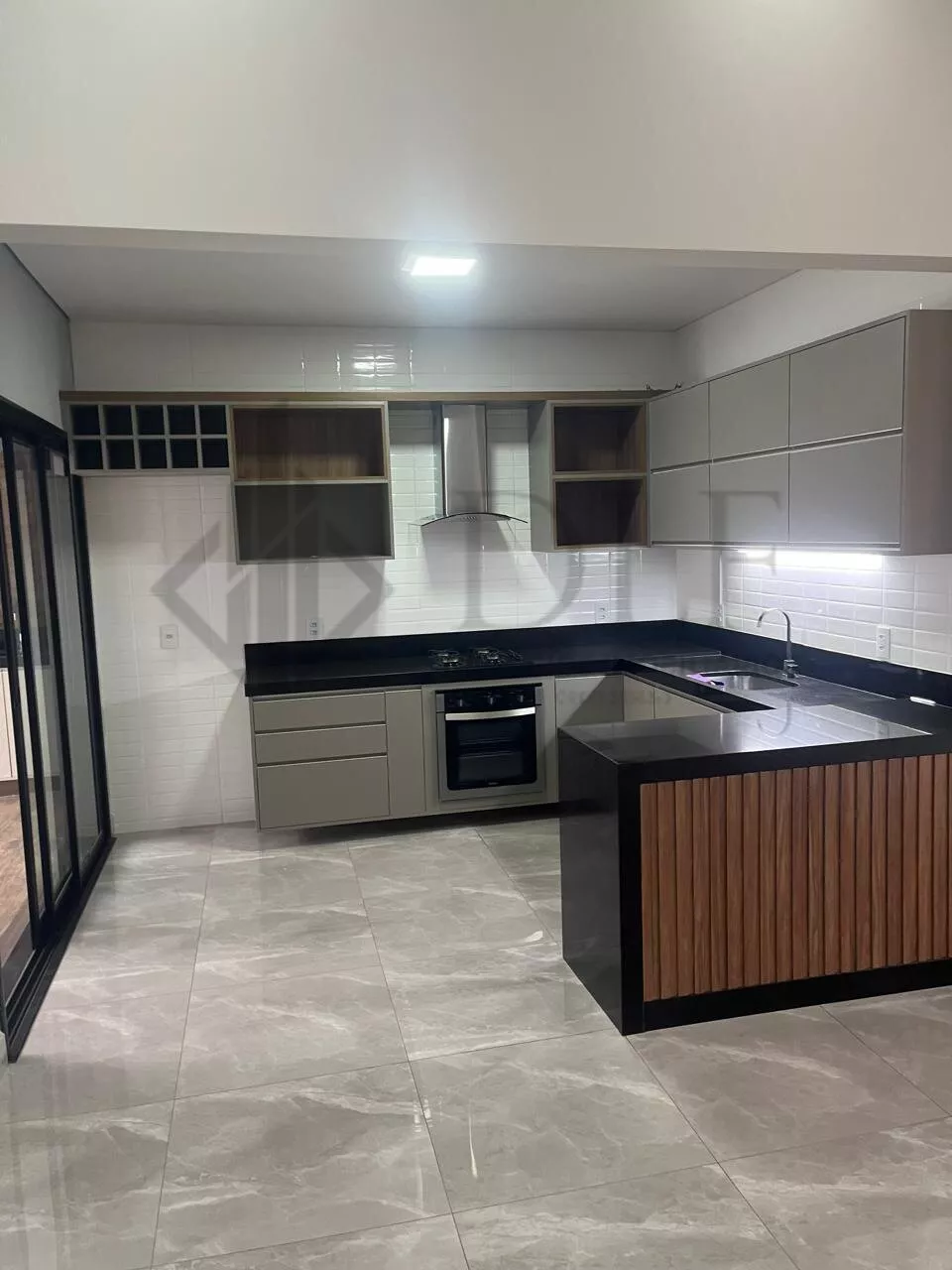 A residência conta com sala de jantar e sala de visita, todas com iluminação LED e pé direito de 4,8 metros, proporcionando um ambiente amplo e iluminado. Possui armários embutidos no quarto suíte e móveis planejados na cozinha e na sala, que tem um design ripado sofisticado. Inclui eletrodomésticos modernos, como cooktop, forno elétrico e exaustor, ideal para quem gosta de cozinhar.