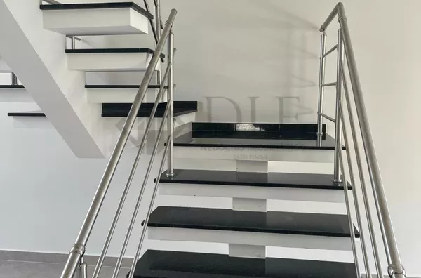 Destaques incluem guarda-corpos em aço inox escovado nas sacadas e escada, preparação para ar-condicionado e água quente, além de esquadrias de alumínio preto sob medida. O quintal é amplo, com cerca de 90m² livres, oferecendo excelente espaço para lazer e futuras adaptações.