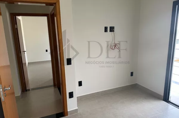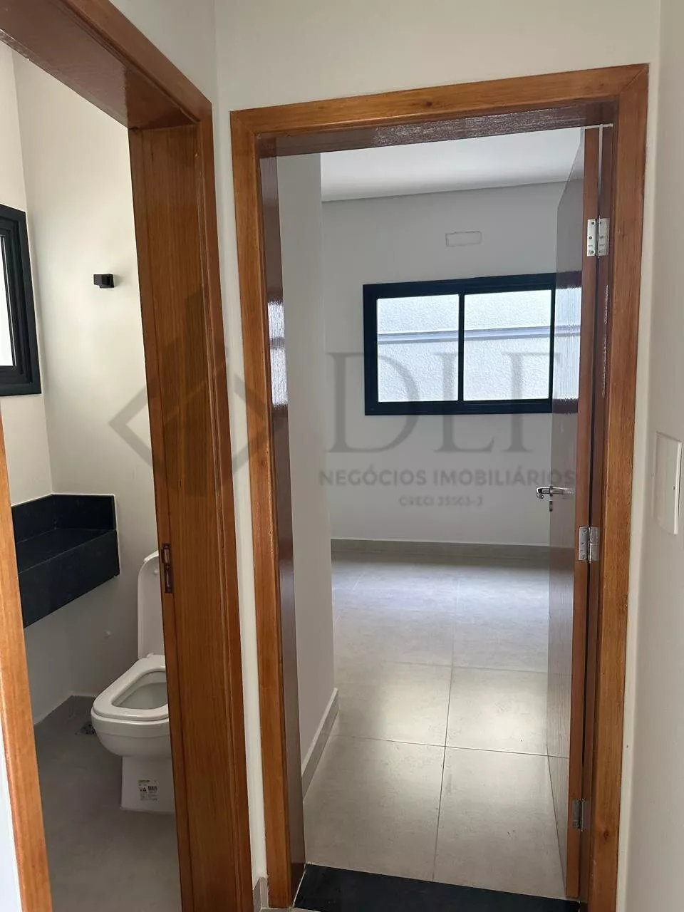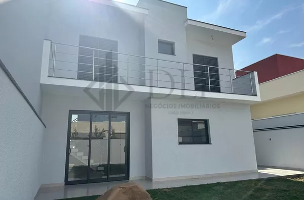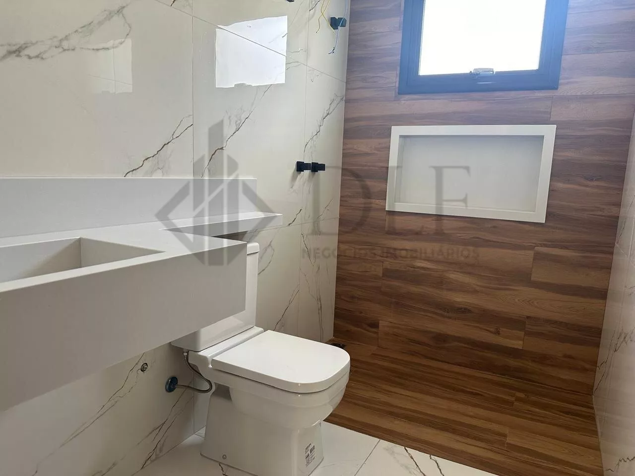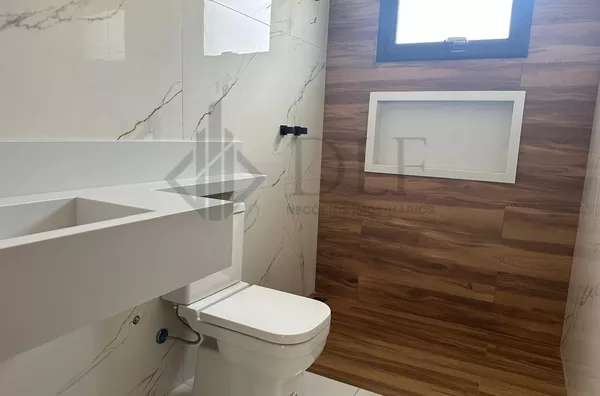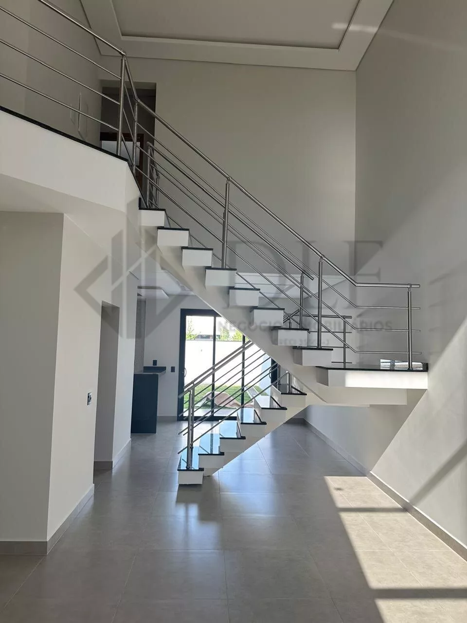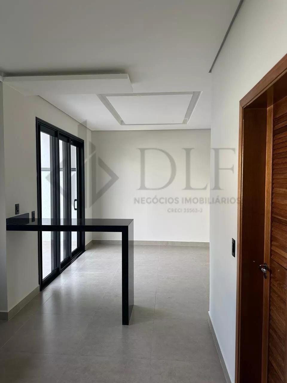 Casa moderna à venda em condomínio fechado e com excelente localização. Conta com garagem para quatro carros, sala de estar com pé direito alto, porcelanato e sancas. Cozinha sofisticada, três quartos (incluindo uma suíte) e um escritório no pavimento inferior.