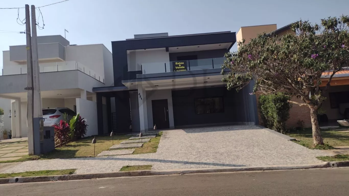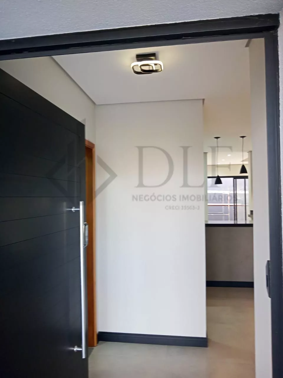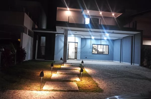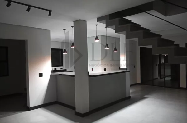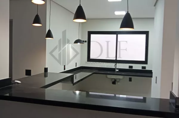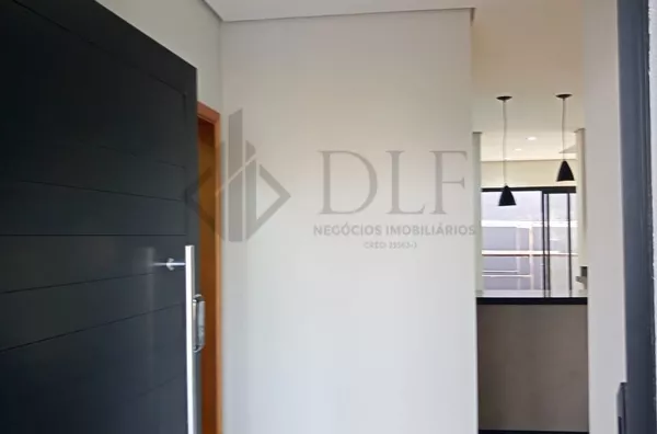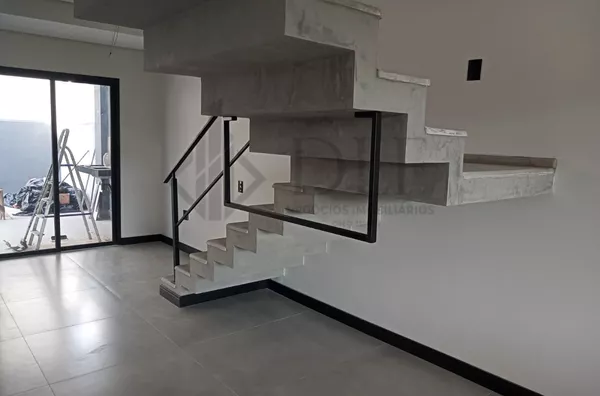 A residência dispõe de garagem coberta para 2 veículos, hall de entrada que confere sofisticação ao acesso, e uma ampla sala de estar e jantar integradas, criando um ambiente de convivência espaçoso e confortável. A cozinha americana é moderna e funcional, acompanhada de despensa e lavanderia independentes, proporcionando praticidade no dia a dia.