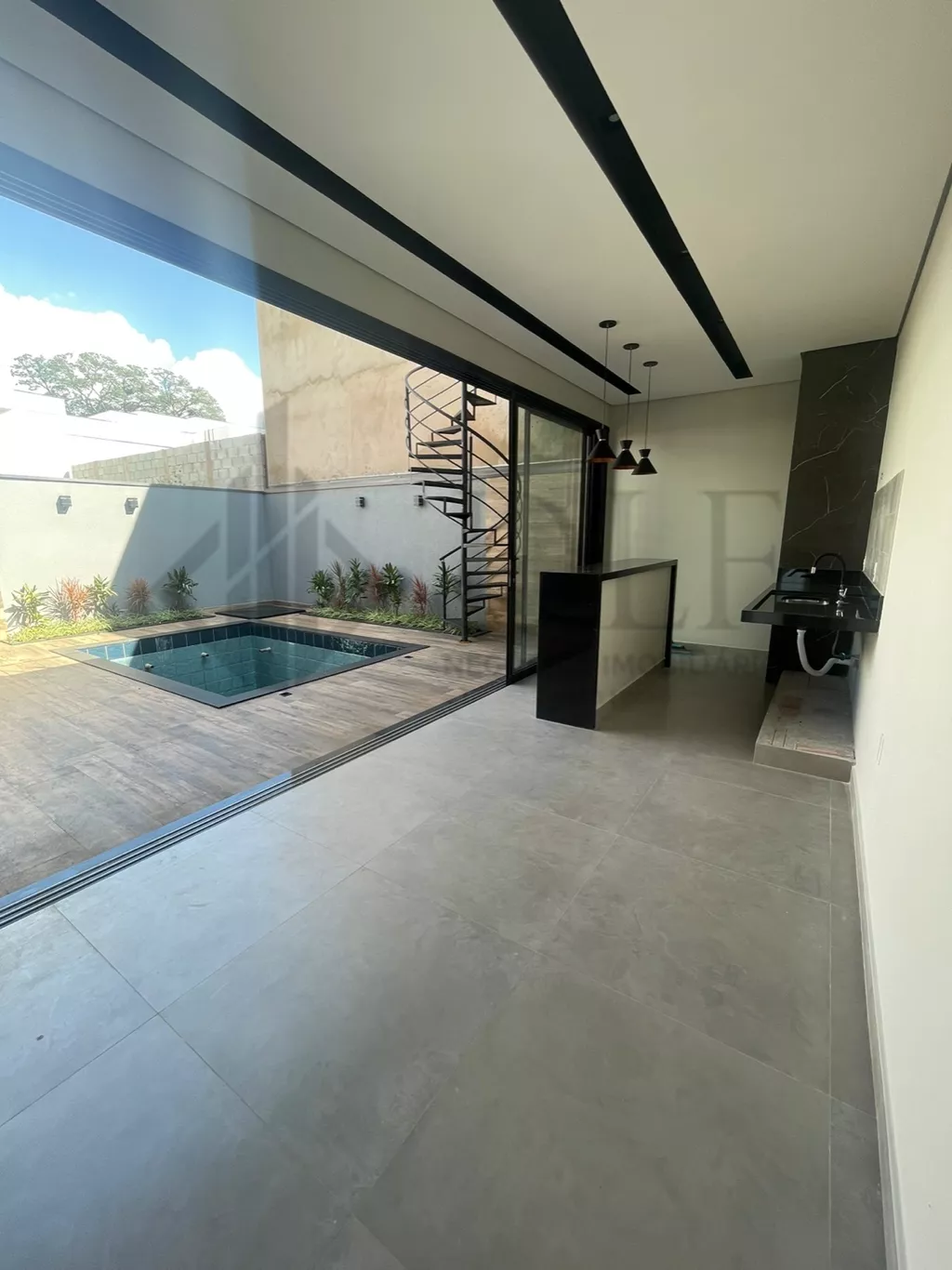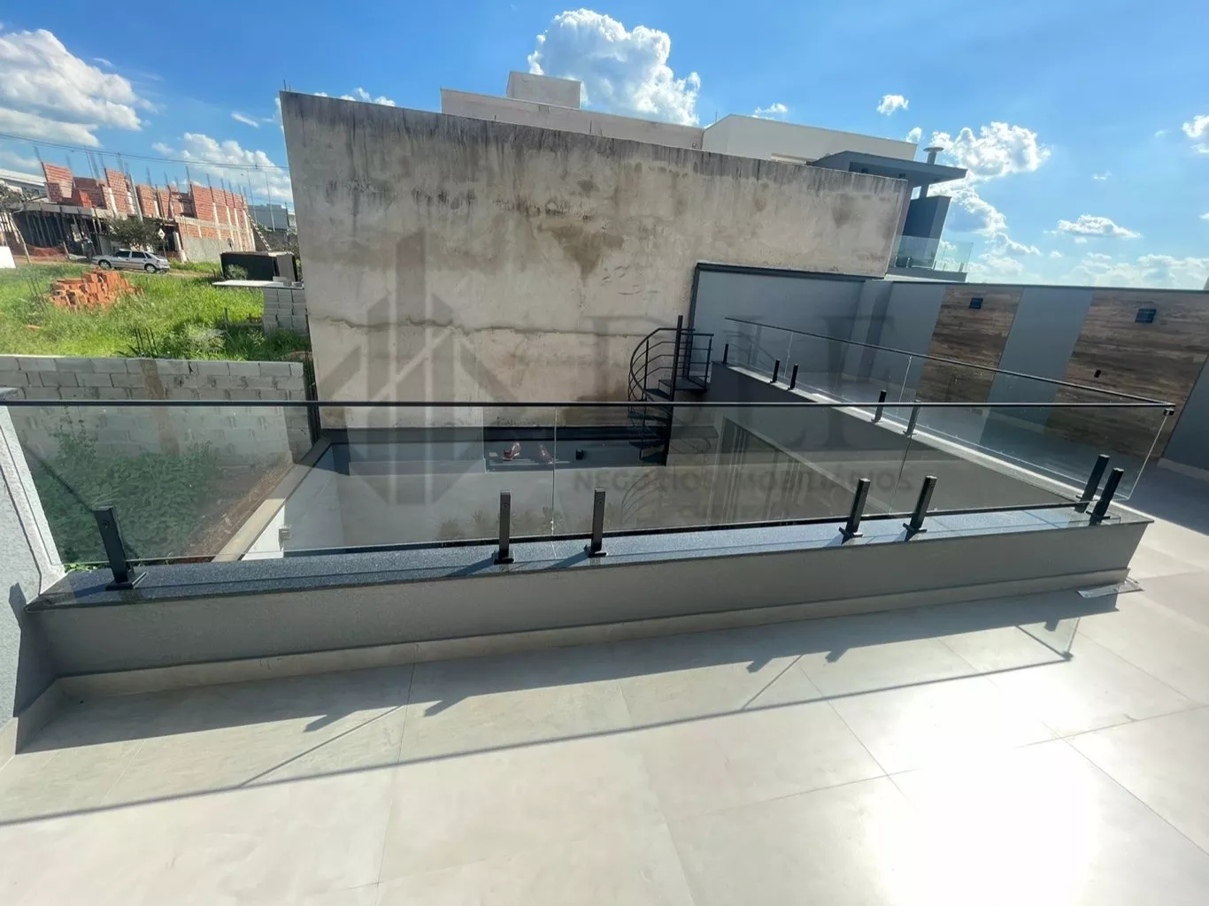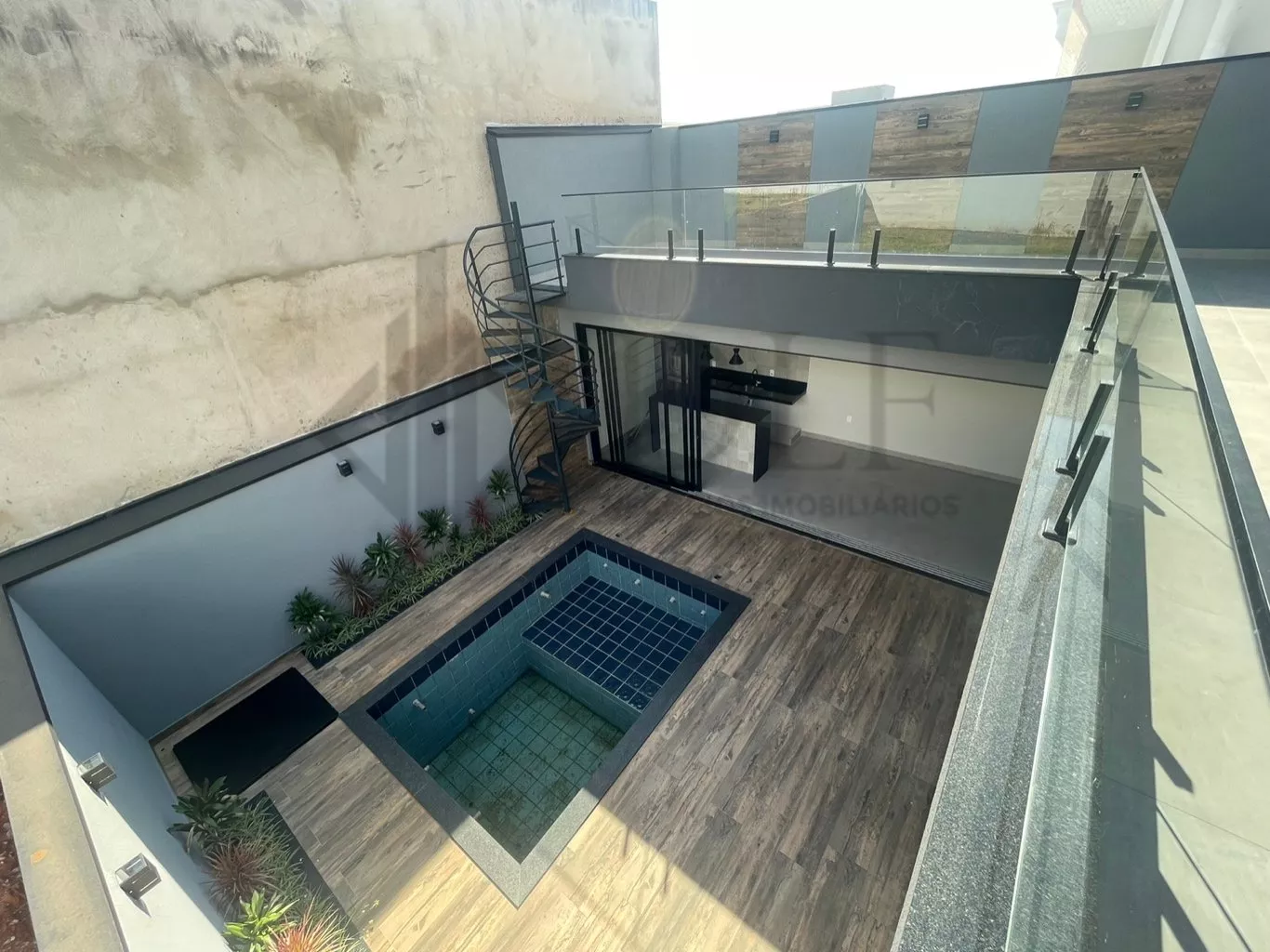 Uma linda escada caracol no quintal dá acesso ao piso superior da área gourmet com vista para a piscina, um espaço aconchegante para receber seus convidados