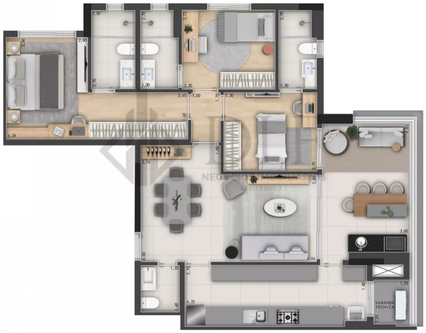 Torre única, projeto envolvente, elegante e refinado, 4 apartamentos por andar, num total de 76 apartamentos com 115m² e 117m². Apartamentos com 3 suítes, varanda gourmet sala de estar/jantar, lavabo, suíte master com closet e 2 vagas de garagem.