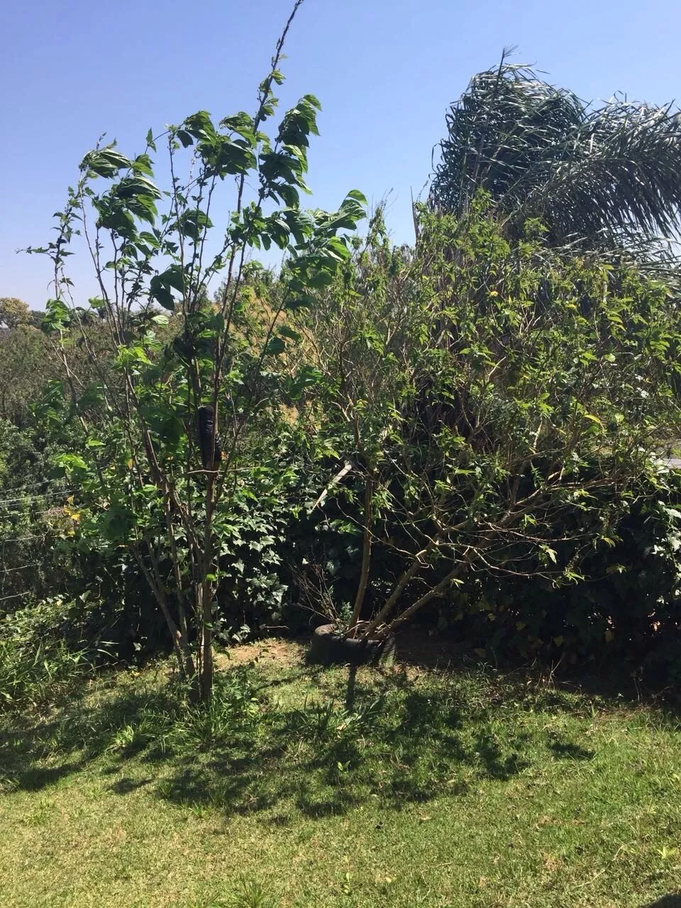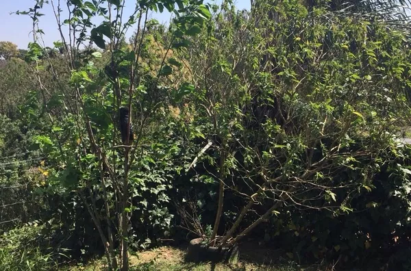 Área gourmet com churrasqueira, pia, armários e pequeno quintal gramado com algumas árvores frutíferas: banana, uva, pitanga, amora e limão.