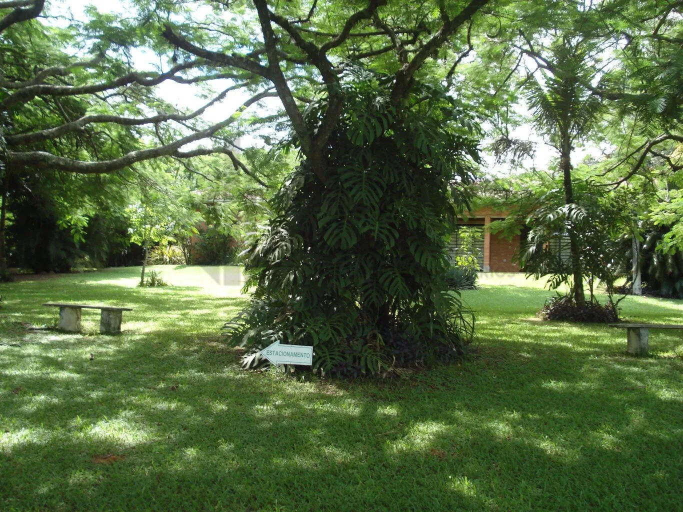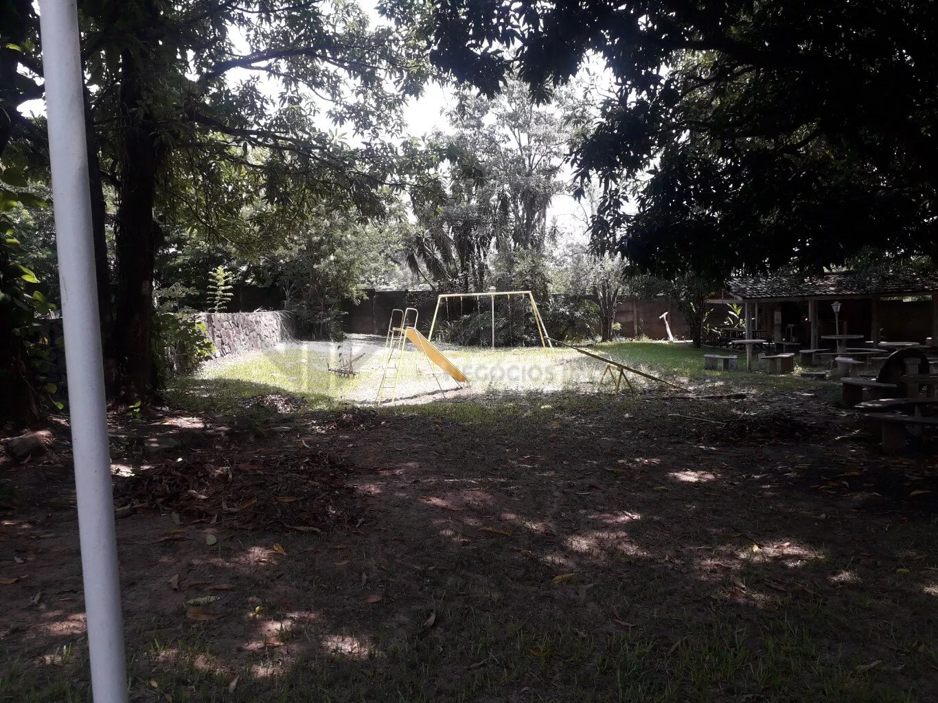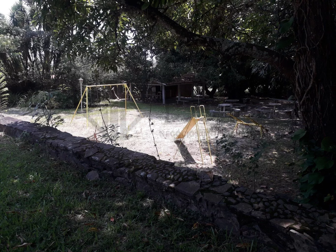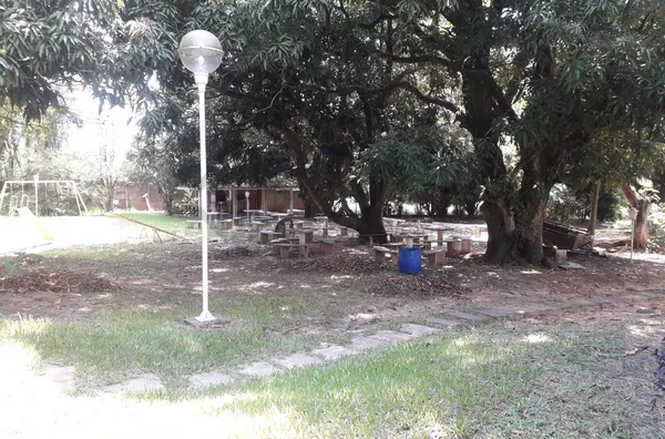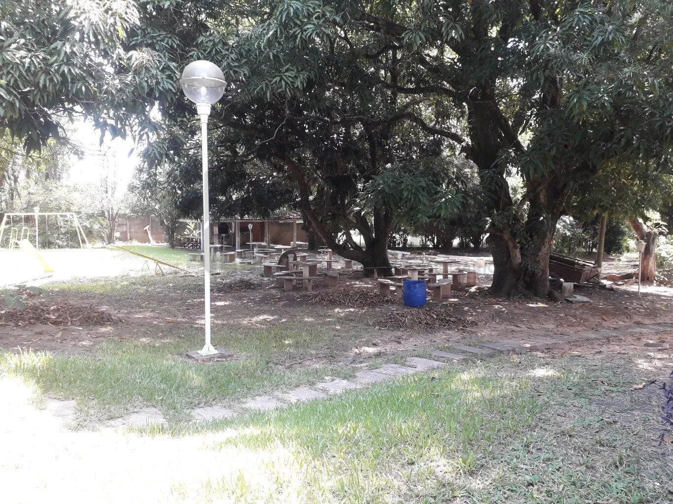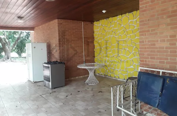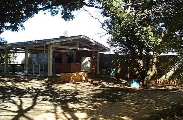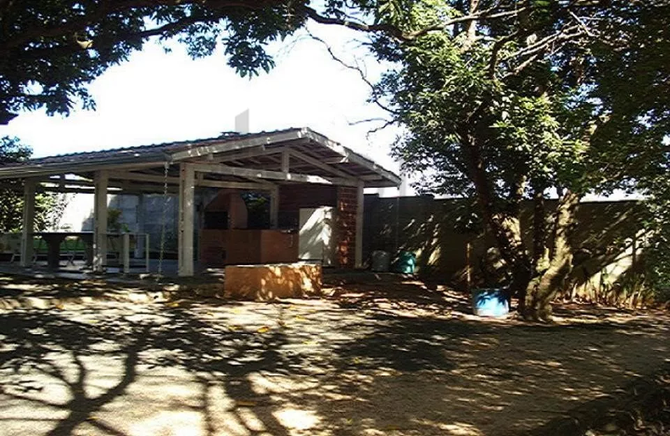A churrasqueira coberta, com pia, convida para momentos de confraternização, com oito mesas fixas sob frondosas mangueiras.