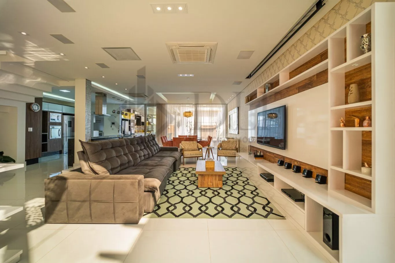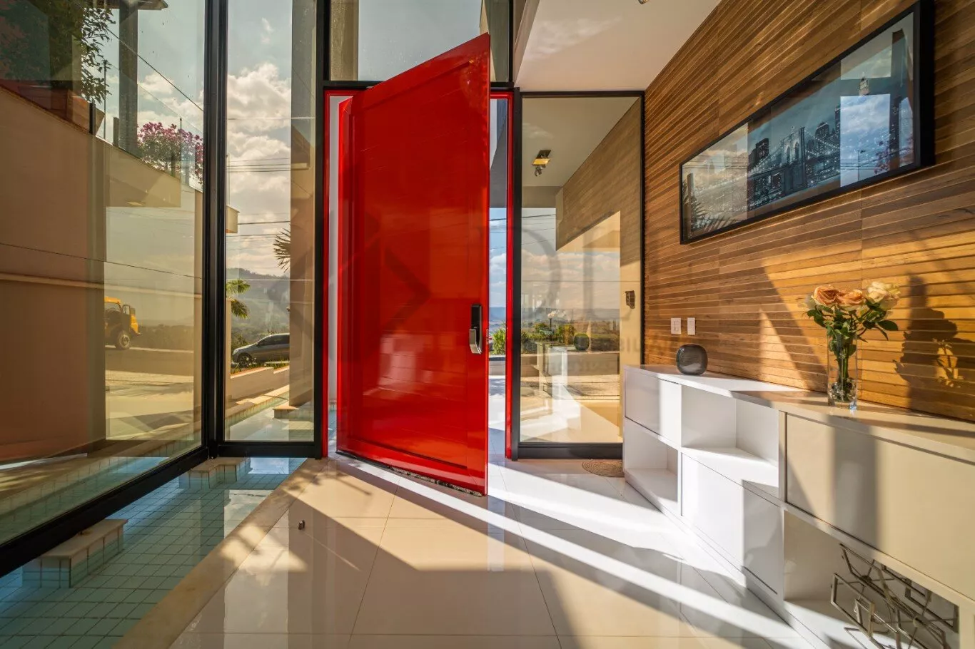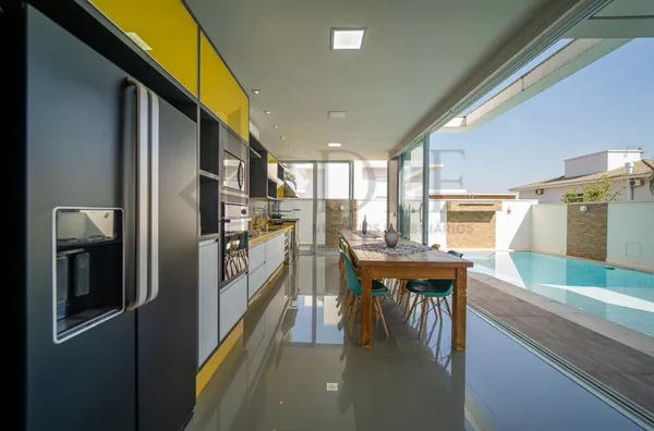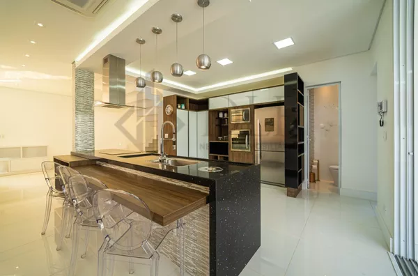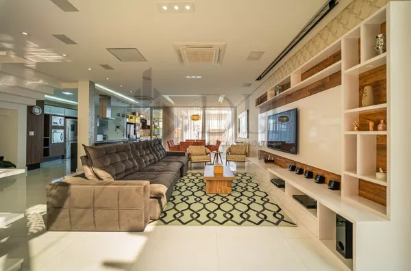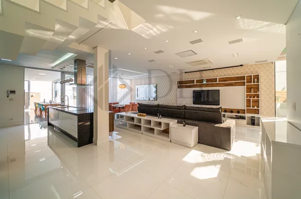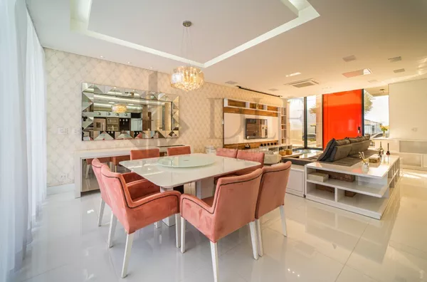 Oferecida em porteira fechada, esta residência impressiona logo na entrada com uma garagem para 3 carros cobertos e espaço adicional para mais 3 na garagem de gaveta.